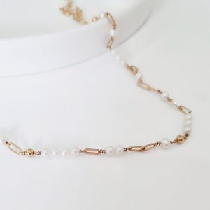 An elegant necklace with the message “Always with you” in Morse code using freshwater pearls and Paperclip link chain.